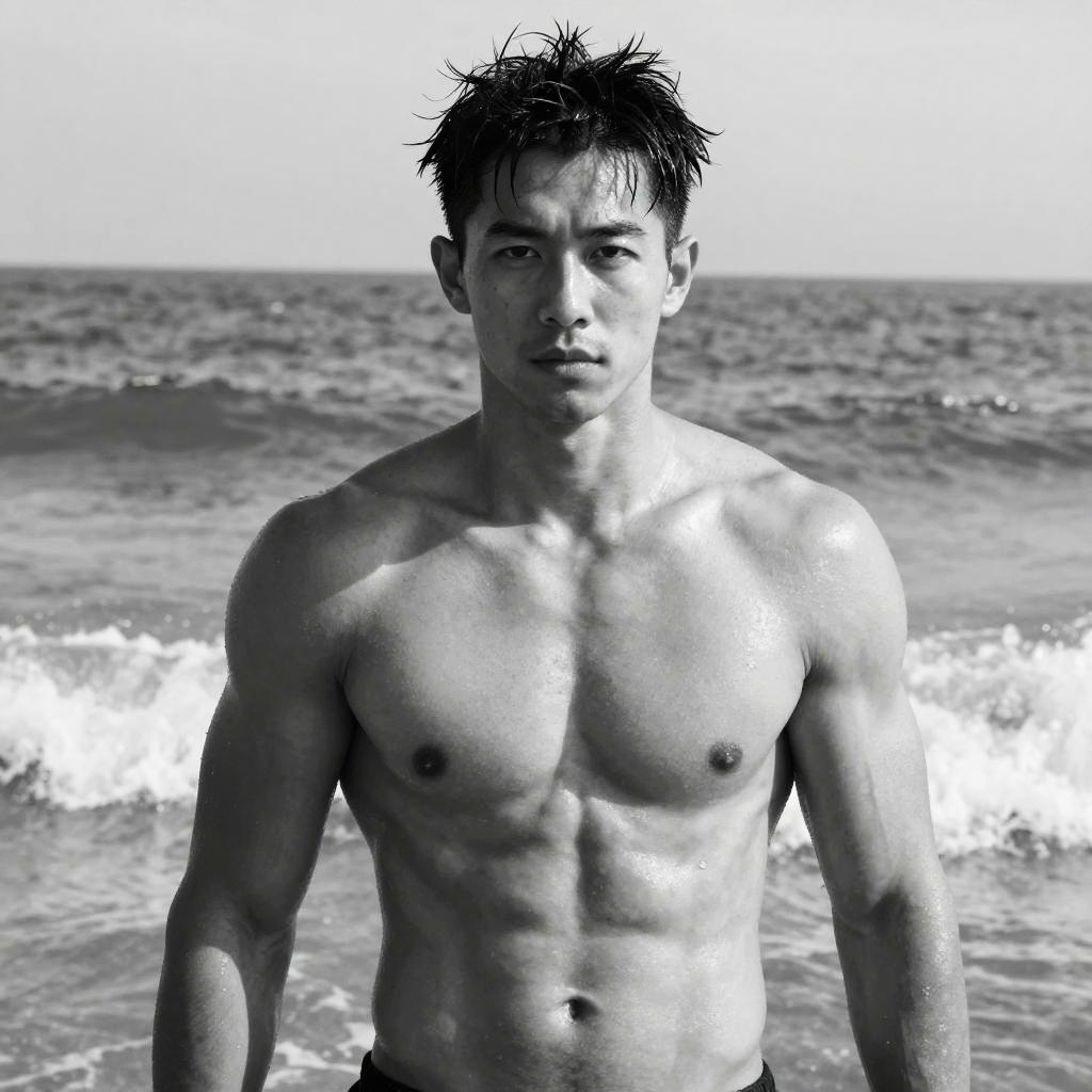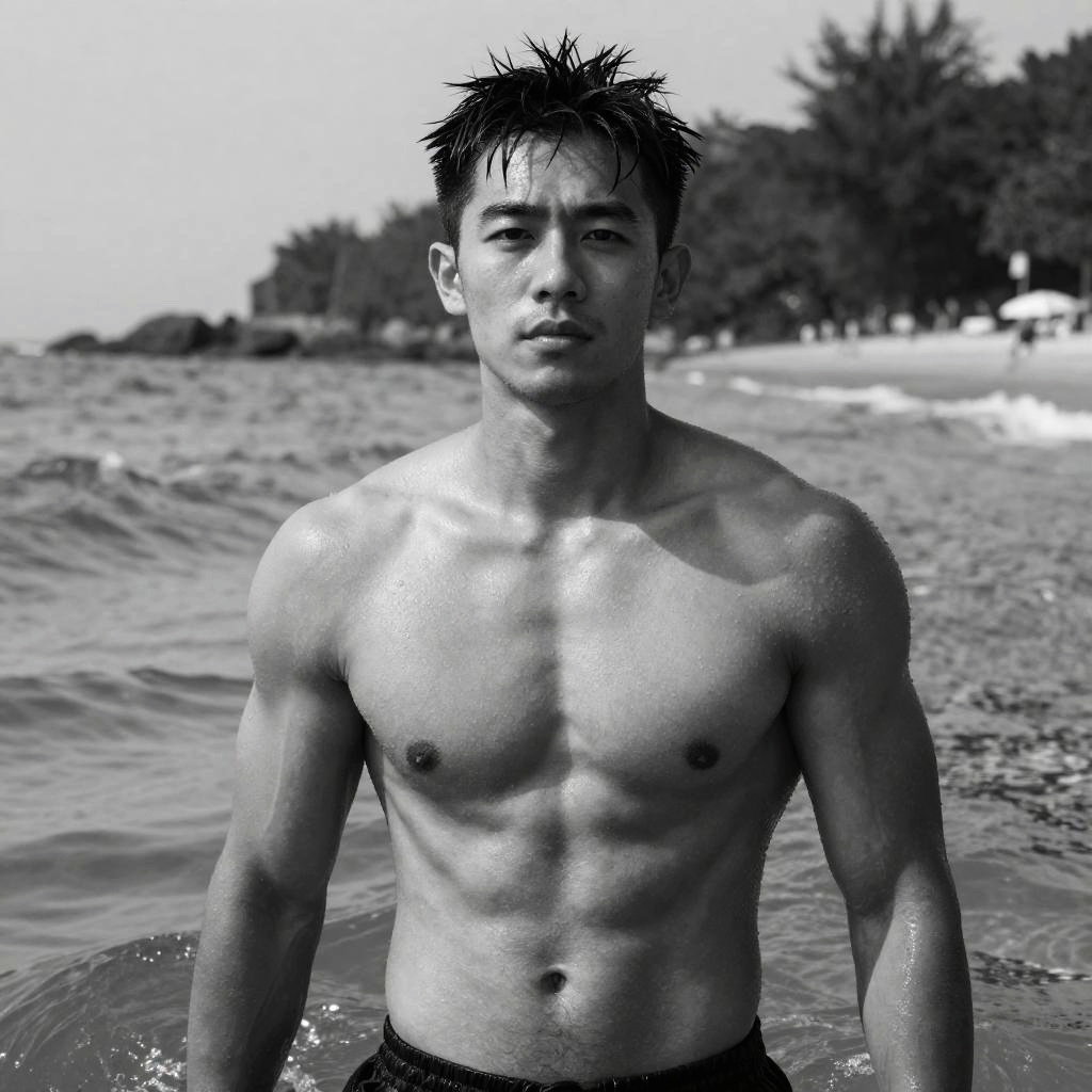 Black-and-white photograph of a young, Asian male standing in shallow ocean water. He has a lean, muscular build with defined abs and small, dark nipples. His short, wet hair is spiked, and his expression is neutral. He is shirtless, wearing dark swim trunks. The background shows a sandy beach with blurred figures and trees in the distance. The water around his waist is slightly rippled, reflecting light. The overall texture is grainy, emphasizing the wet, shiny skin. The image has a high-contrast, dramatic style.