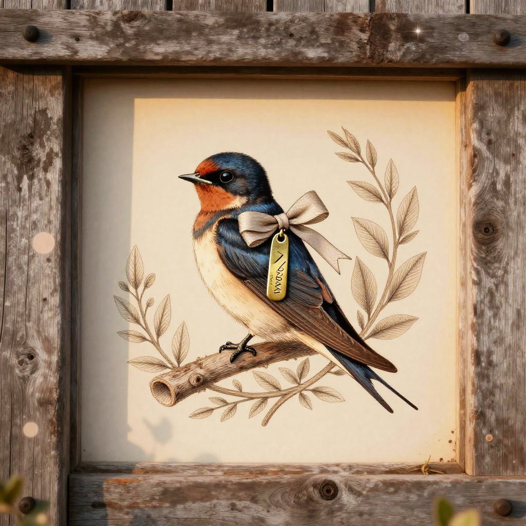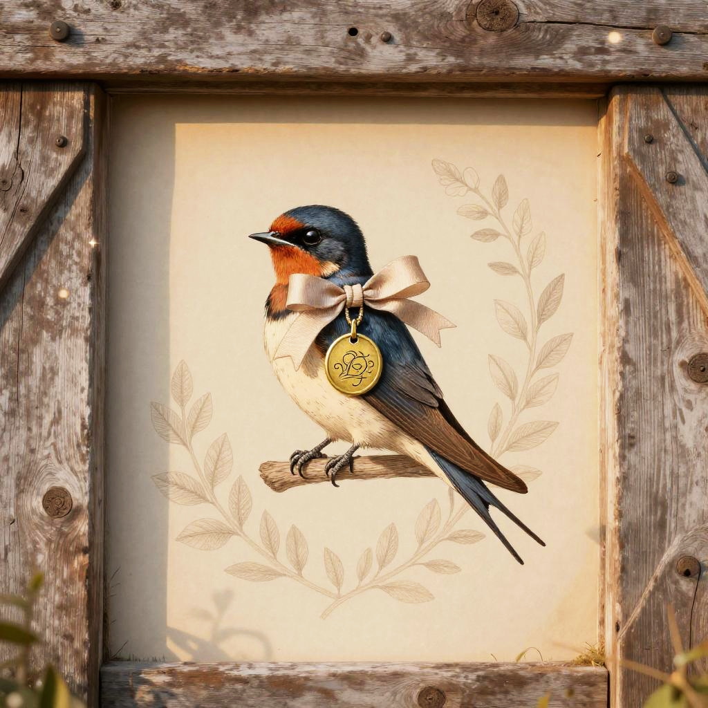 A elegant barn swallow wearing a ribbon-tied bow and etched brass pendant, set in a rustic barn doorway suffused with warm sunset hues, vintage illustration aesthetic with delicate linework and fine crosshatching, muted warm palette on a soft cream backdrop, ornate botanical detailing, gentle and charming atmosphere, soft rim lighting, subtle paper grain texture, balanced and symmetrical composition, slight vignette, natural bokeh sparkle, ultra clean edges, high fidelity details