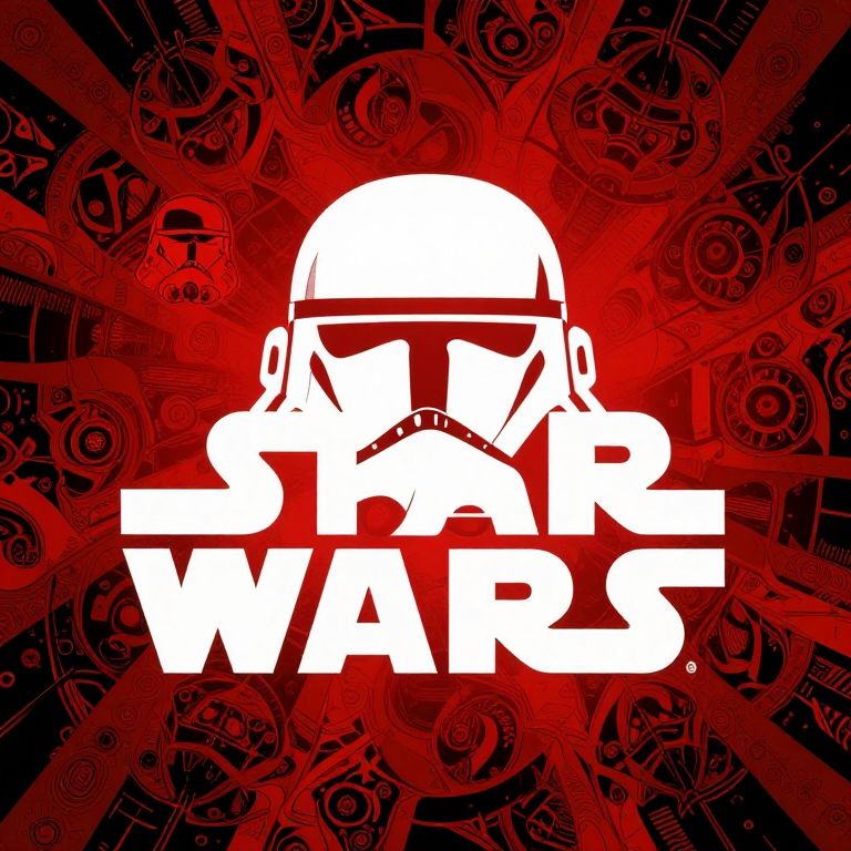 Digital artwork: White Star Wars logo with a Stormtrooper helmet, bold text, and red background with intricate black mechanical patterns.