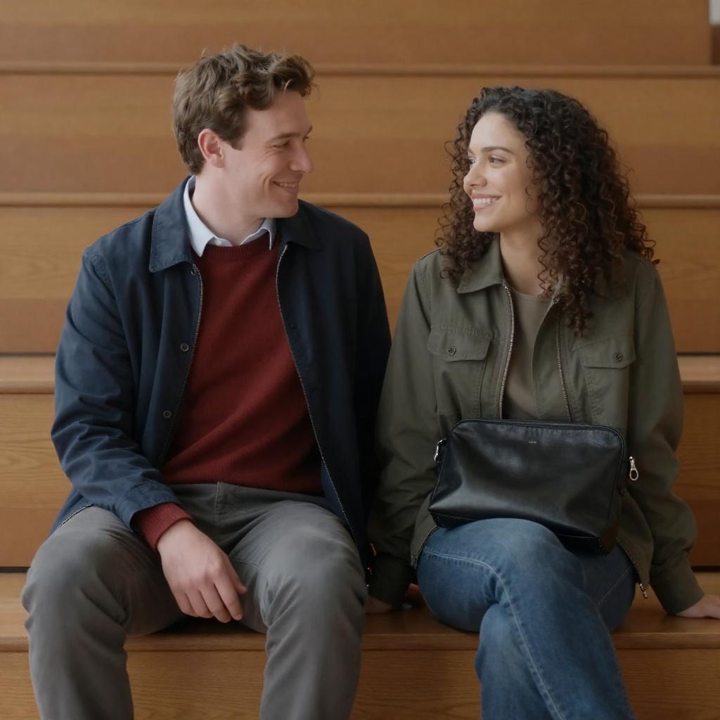 Photograph of a man and woman standing in a kitchen. Man with short, messy blonde hair, green shirt, black pants, smiling, leaning slightly forward. Woman with shoulder-length brown hair, white floral dress, smiling, standing with hands together. Bookshelf with books and a small statue in background. Kitchen with wooden cabinets and tiled backsplash. Both facing each other.