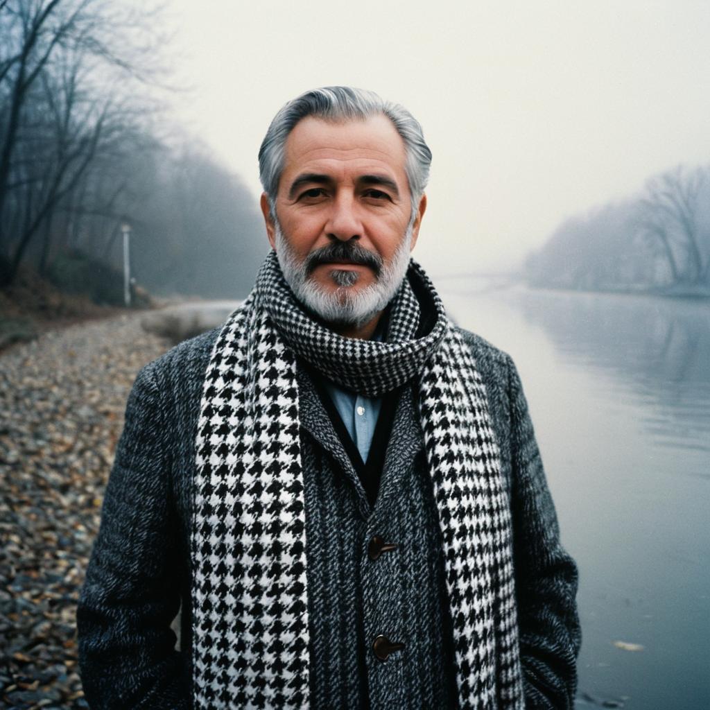 Portrait of a gray-haired elderly man with a beard standing beside a foggy riverside at dawn. He is wearing a black and white houndstooth coat and a matching knitted scarf, exuding a confident and rebellious vibe. The scene has a cinematic film still quality, reminiscent of Kodak Portra film, with muted, soft lighting and bare trees in the background.