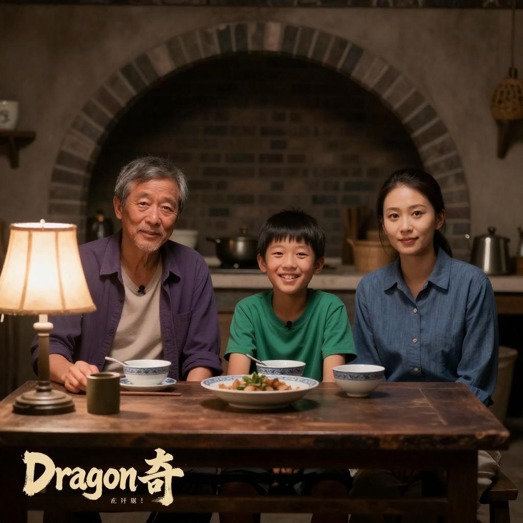 Photograph of three Asian individuals in a dimly lit, rustic kitchen. A smiling young boy in green sits between an older man in purple and a woman in blue. Table with bowls, cups, and a lamp. "Dragon Seed" movie poster in the bottom left corner. Background features an arched brick wall.