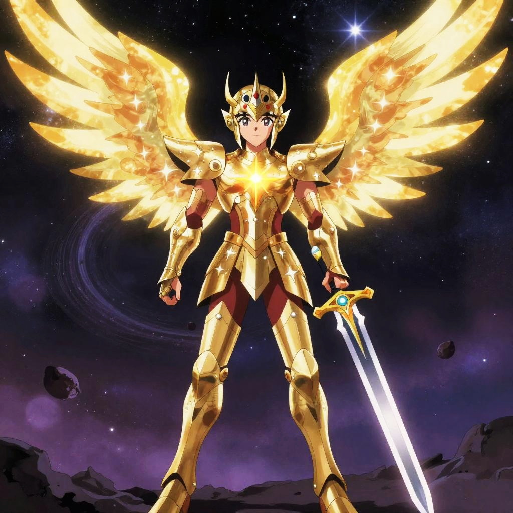 A celestial guardian, with radiant armor with star motifs and glowing wings, holding an ancient celestial sword, standing in a cosmic battlefield with swirling nebulae, drawn in the atmospheric and emotionally charged anime style of Sui Ishida.