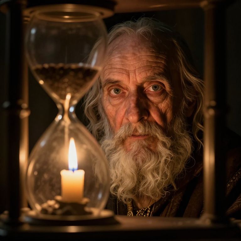 Photograph of an elderly man with a long white beard, intense expression, illuminated by a candle and hourglass in a dimly lit setting.