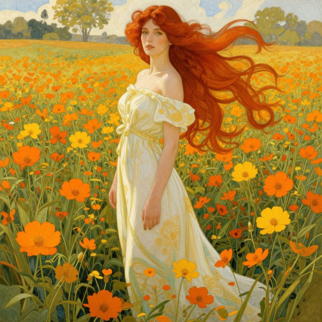 Elegant woman with flowing red hair stands gracefully amidst a vibrant field of orange and yellow flowers, embodying the essence of summer in a serene, artistic composition reminiscent of Alfons Mucha's style.