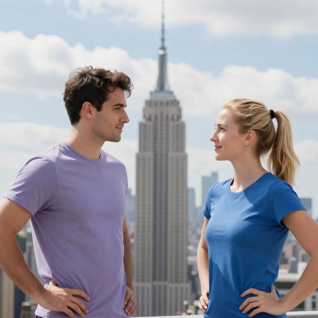 Photograph of two people facing each other against a city skyline with the Empire State Building in the background. Man on left has short, dark hair, light skin, wearing a lavender t-shirt, looking intently at woman. Woman on right has blonde hair in a ponytail, light skin, wearing a blue t-shirt, smiling slightly. Both stand with hands on hips. Sky is light blue with scattered clouds.
