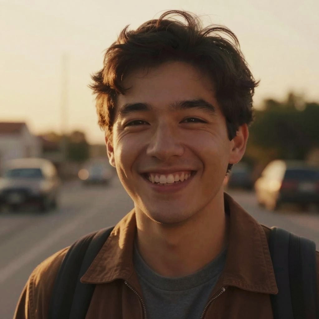 Photograph of a young Asian man with short, dark, slightly messy hair, smiling broadly. He has a medium build and light brown skin. He is wearing a light gray, casual, crew-neck t-shirt. The background is slightly blurred, showing a sunlit urban street with green trees, parked cars, and indistinct buildings. The man is centered in the frame, with sunlight highlighting his face, creating a warm, friendly atmosphere. The overall image has a sharp focus on the subject with a shallow depth of field.