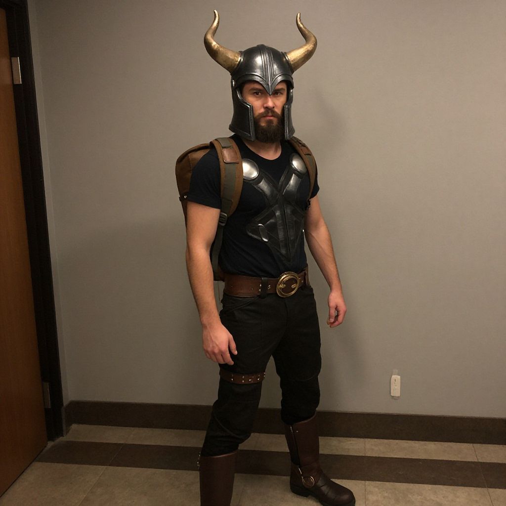"thor backpack costume, 1boy, solo, male focus, horns, fake horns, helmet, horned helmet, beard, facial hair, full body, standing, backpack, bag, boots, looking at viewer, pants, belt, indoors, closed mouth Realistic photo of casual sexy person with pretty face"