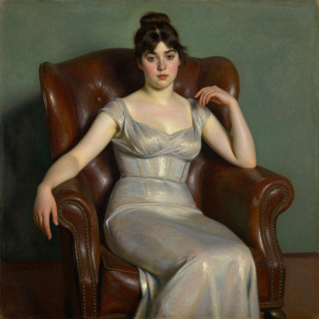 This is a digital reproduction of a 19th-century oil painting depicting a young woman of European descent seated in a large, brown leather armchair. She has pale skin, dark hair styled in an updo, and wears a shimmering, silver-gray, sleeveless gown that clings to her figure. Her right arm rests on the armchair's armrest, while her left arm is raised, with her hand gently touching her shoulder. She gazes directly at the viewer with a calm, slightly serious expression. The background is a plain, muted green wall, contrasting with the dark brown of the armchair. The painting exudes a realistic style with detailed textures, emphasizing the softness of the woman's skin and the leather's grain.