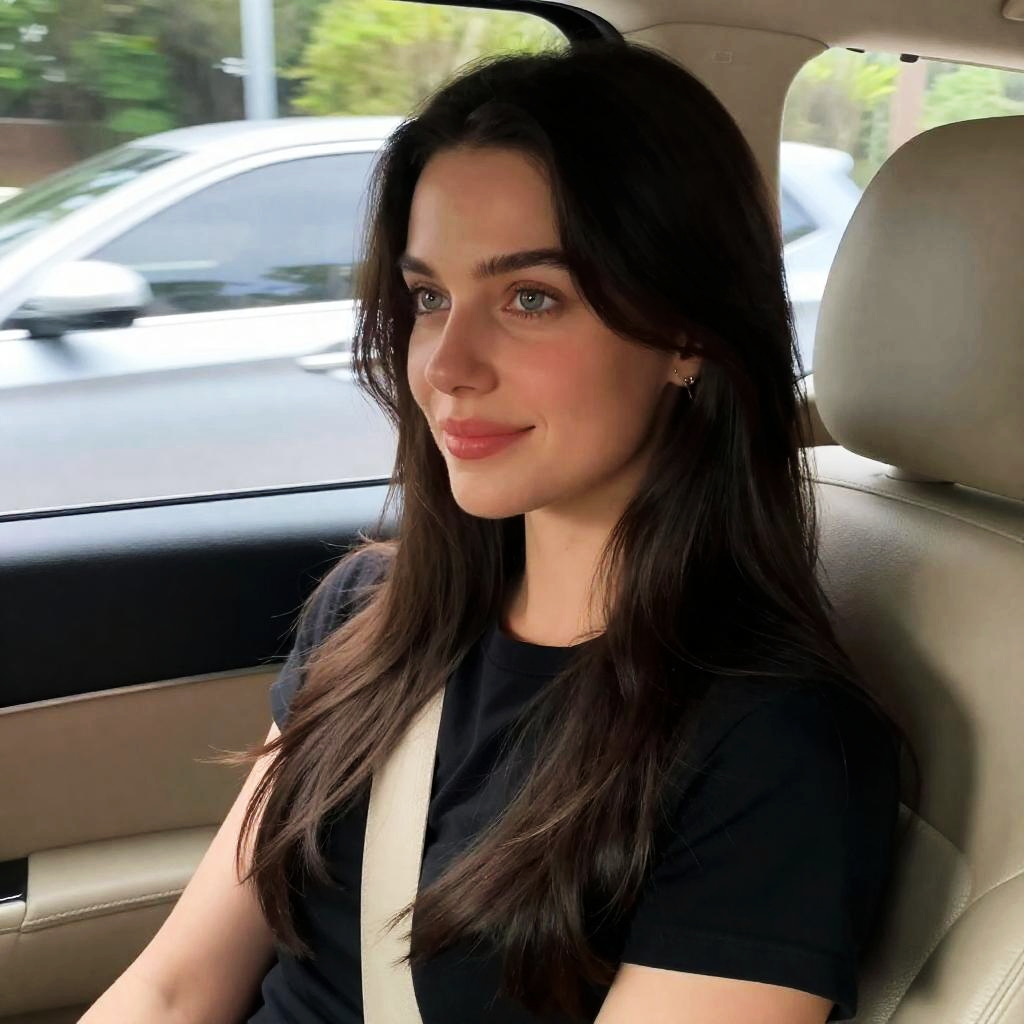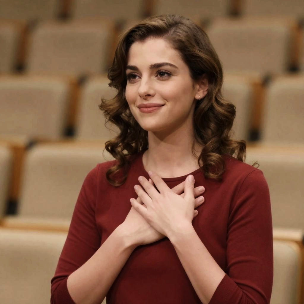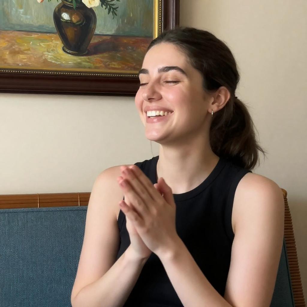 Woman with dark brown hair in a ponytail, wearing a sleeveless black top, smiling broadly with eyes closed. She sits on a blue and brown wicker couch. A framed painting with a vase and flowers hangs on a beige wall behind her. She clasps her hands together near her chest.