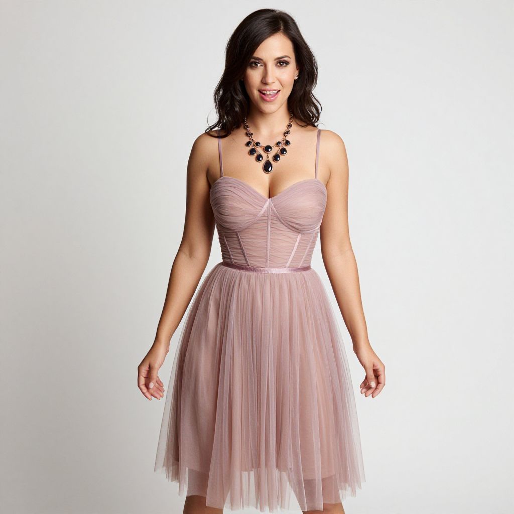"Woman, flirtatious cocktail style, dusty pink dress with sweetheart neckline, structured bodice, thin straps, knee-length tulle skirt with subtle gathers, chunky statement necklace with dark stones, smiling expression, studio backdrop with a plain white background.. Sexy. Pretty face and beаutiful eyes. Big breasts."