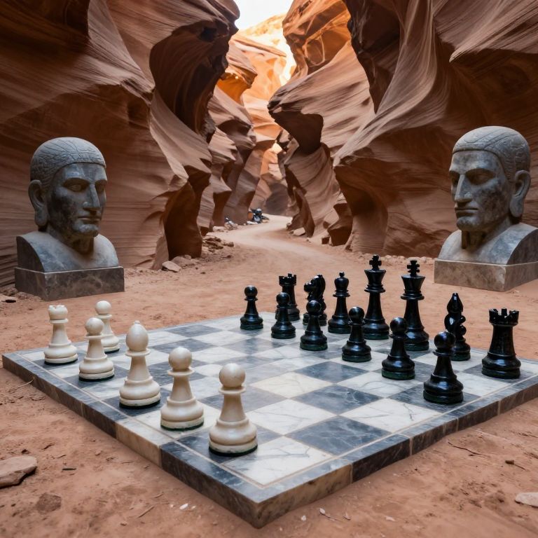 Photograph of a chessboard set in a narrow, sandy-red rock canyon with towering, curved walls. The chessboard, featuring black and white pieces, is placed on the ground between two identical stone busts of a bearded man with short hair, positioned on the left and right. The canyon's sunlight filters through the narrow opening at the top, illuminating the scene with a warm glow. The sandy, textured ground contrasts with the smooth, glossy chess pieces and stone busts. The composition blends natural and man-made elements, creating an intriguing, surreal atmosphere.