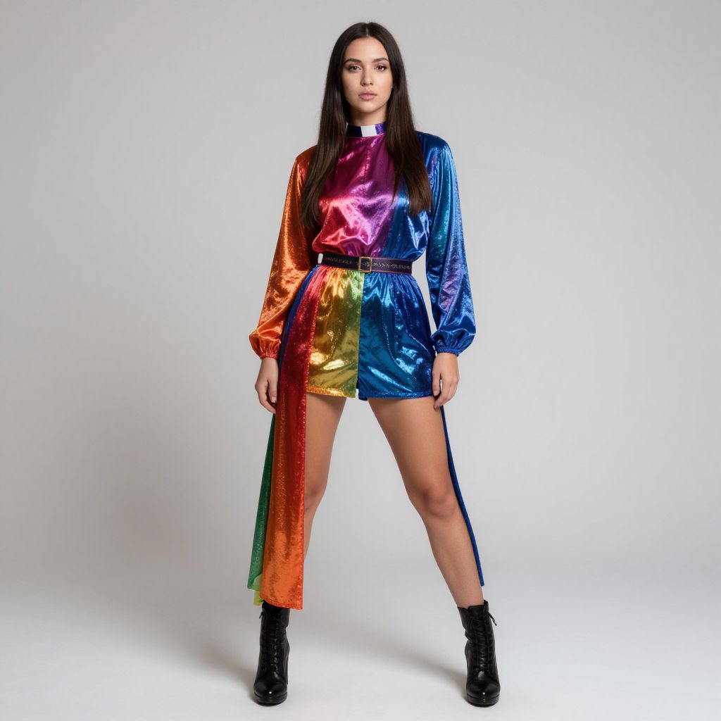 Photograph of a young woman with long, straight black hair and fair skin, standing against a plain white background. She wears a shiny, long-sleeve, rainbow-colored satin top and high-waisted shorts in vertical stripes of gold, blue, purple, and red. The shorts have long, slit sides revealing her bare legs. She pairs the outfit with black ankle boots. Her expression is neutral, and she stands with legs slightly apart, hands resting by her sides. The texture of the satin is highly reflective, catching light and creating a vibrant, eye-catching effect.