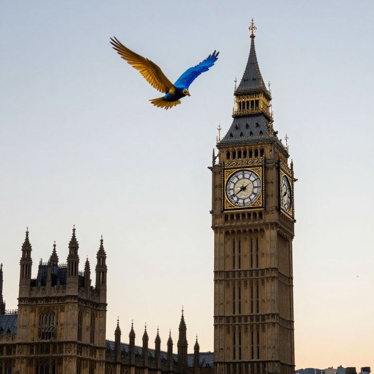 Photograph of a blue and gold parrot flying above the iconic Big Ben clock tower against a clear, twilight sky.