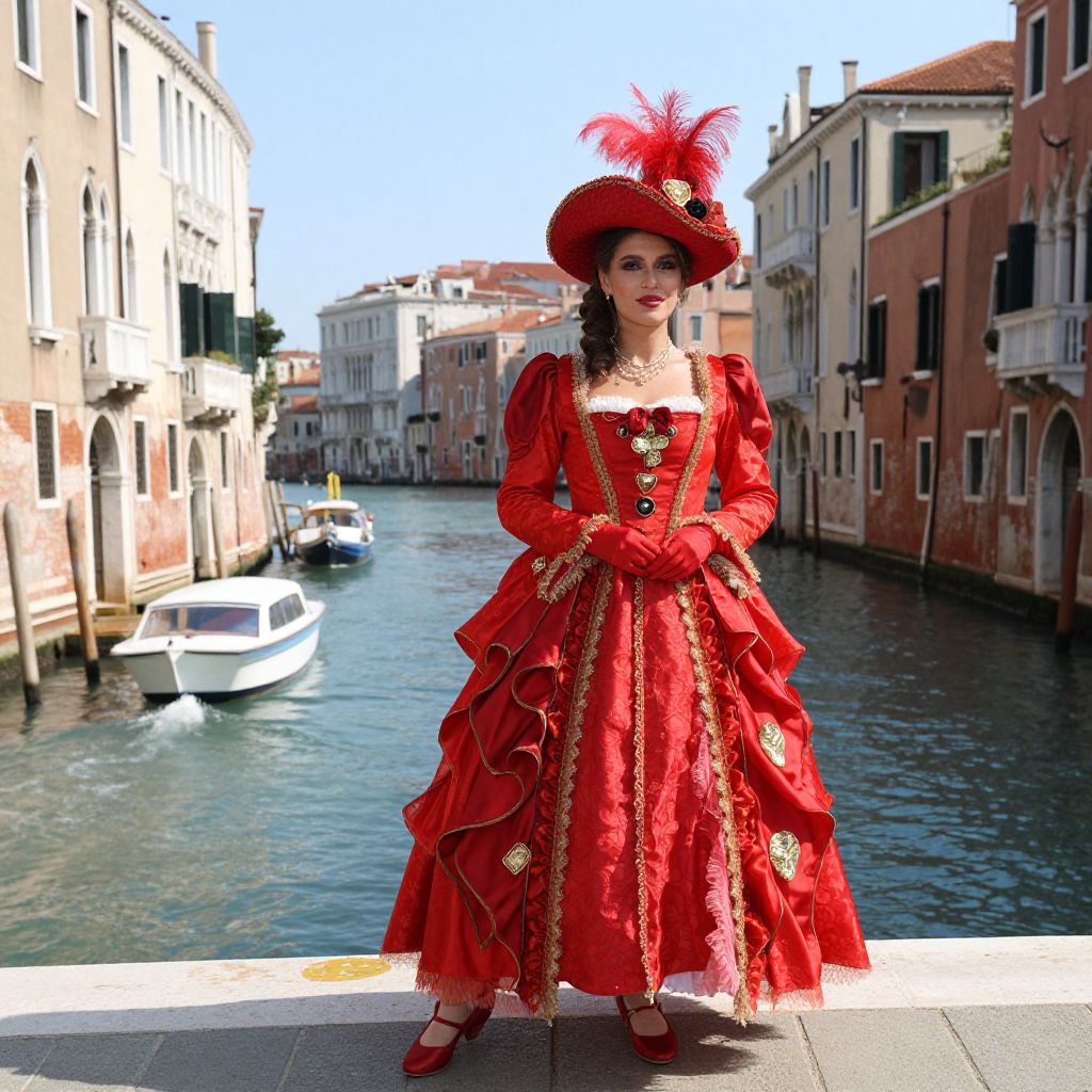 Woman in a vibrant red Venetian costume stands gracefully on a bridge, her elaborate feathered hat and flowing gown contrasting beautifully against the historic canal backdrop of Venice, where boats gently float along the waterway lined with colorful buildings.