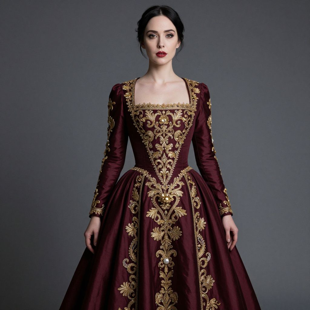 Photograph of a pale-skinned woman with dark, wavy hair, styled in an elegant updo. She wears a deep burgundy, Renaissance-style dress with a square neckline and long sleeves, adorned with intricate gold floral embroidery. The dress has a fitted bodice and a full, voluminous skirt. Her makeup is dramatic, with bold red lipstick and dark eye makeup. She stands against a solid, dark gray background, which contrasts with her dress and highlights the detailed embroidery. Her expression is composed and slightly serious, looking directly at the camera.