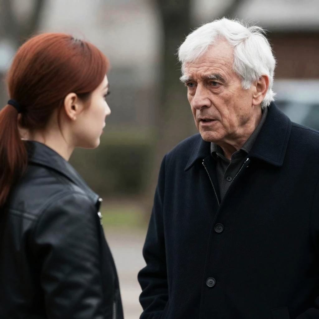 Photograph of an older white man with short white hair, wearing a green jacket over a maroon polo shirt, leaning on a table. Background: blurred crowd of people, some with light brown hair, sitting. Man's expression is serious. Light blue wall in background. Hand on table, slightly forward.