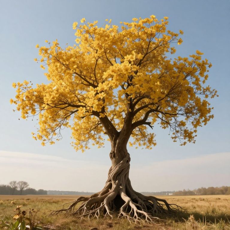 Photograph of a solitary, gnarled tree with vibrant yellow flowers against a clear blue sky. The tree's thick, twisted trunk and exposed roots are prominently visible, standing in a grassy field. Sunlight illuminates the bright yellow blossoms, casting light shadows on the ground. In the background, a distant tree line and open field are visible, adding depth to the serene, rural landscape. The overall composition highlights the tree's natural beauty and the contrast between the yellow flowers and the blue sky.