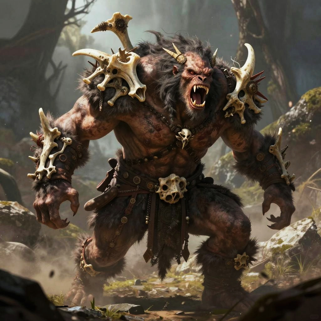 Monster from barbarian full body, primal and savage, adorned with bone decorations and war paint, snarling with sharp teeth, rugged wilderness setting, epic fantasy illustration