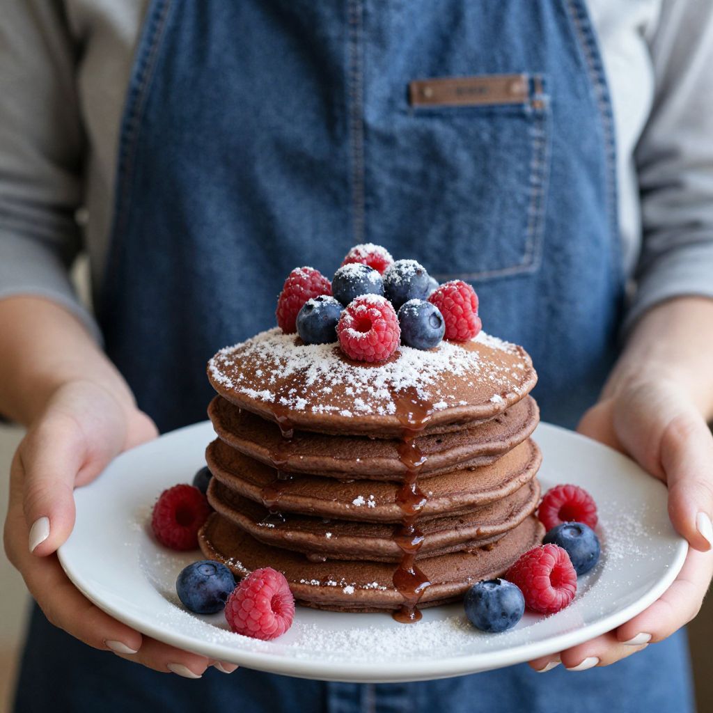 Delicious chocolate pancakes stacked high with vibrant raspberries and blueberries dusted in powdered sugar are presented on a pristine white plate, held gracefully by a woman wearing a charming denim apron.