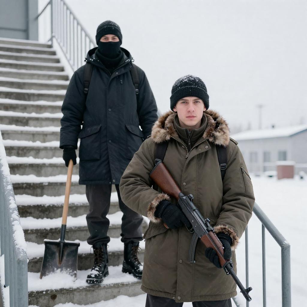 Photograph of three people walking in snowy terrain. They wear brown winter suits, black boots, and gray hats. One person carries another on their back. Background: large rocks, black and orange fire, thick smoke. Snow covers the ground, rocks visible in foreground. People's faces not clearly visible.