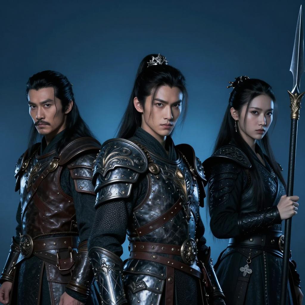 Portrait of a man and woman with long, blue-tinted hair wearing rugged, fur-accented clothing. The man has a slight smirk and disheveled hair, while the woman has braided hair and a neutral expression. The background features a blue-toned forest setting, creating a moody atmosphere.