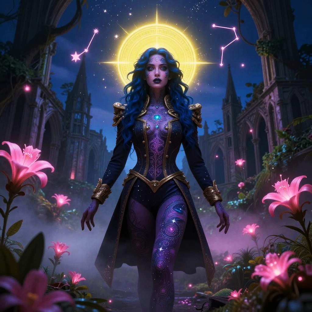 Surreal, vibrant portrait of orla, a mysterious figure with midnight blue waves and celestial tattooed dusky purple skin, set within a ruined cathedral floating over a dense jungle of glowing pink flora and thick mist. They wear an ornate dark uniform with gold accents and arcane sigils; a radiant yellow halo crowns their head as stars scatter across a cobalt sky. Pink flowers drift among constellations, luminous hues, dreamy atmosphere, gothic surrealism overlapped with sci-fi elements and vibrant neon color pops.