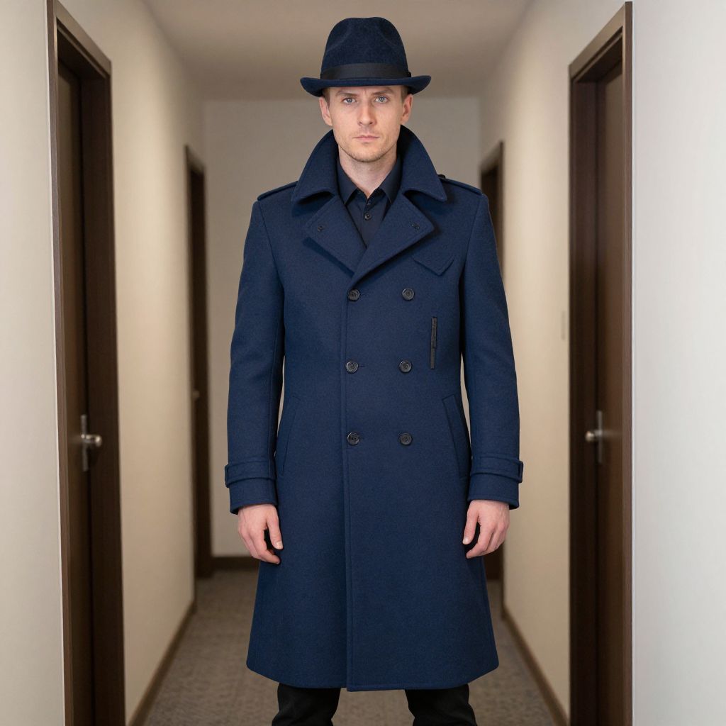 Midnight Original Costume, man in a blue coat and hat standing in a hallway