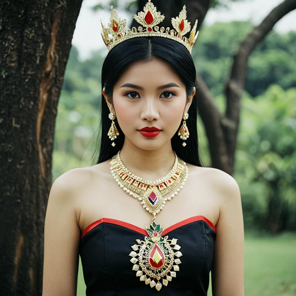 Portrait of a young Cambodian woman wearing a traditional black national costume adorned with intricate gold patterns. She has long black hair styled in twin braids and is accessorized with gold earrings and a matching necklace. The background shows a blurred outdoor setting with historical Khmer-style wooden buildings.