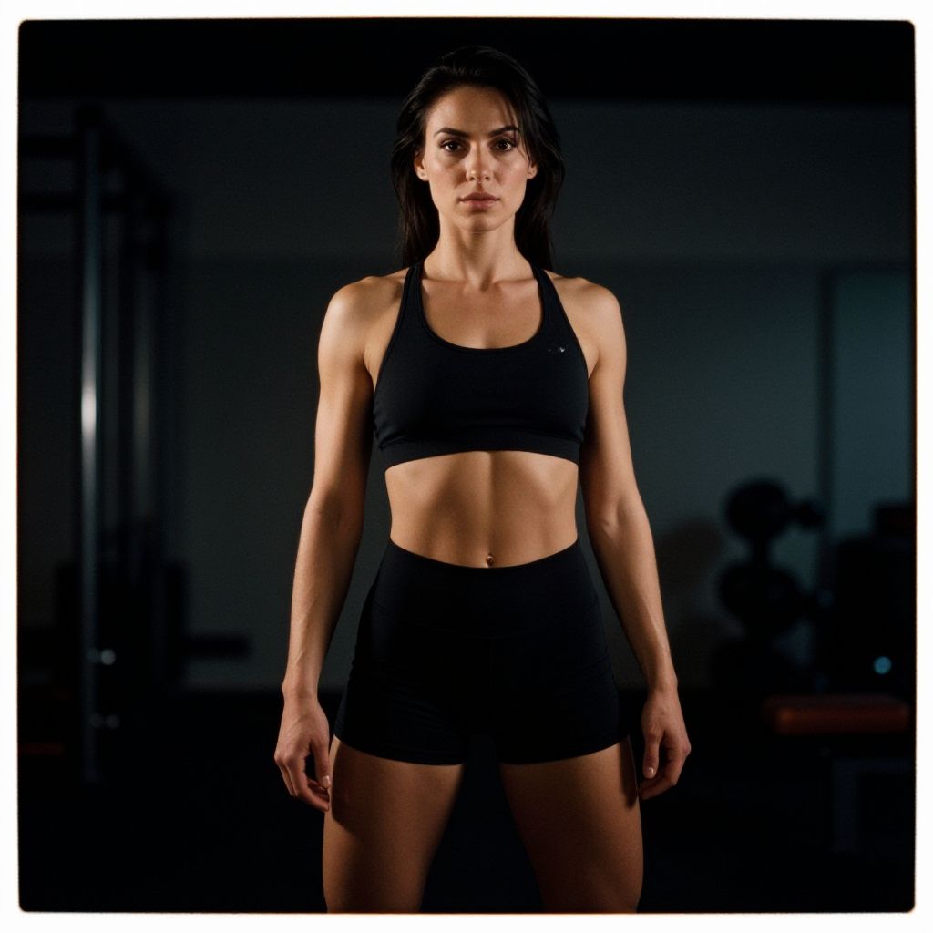 Photograph of a fit, athletic woman standing in a dimly lit gym. She has long, dark brown hair, light skin, and a determined expression. She wears a black sports bra and black high-waisted shorts, highlighting her toned midriff and muscular arms. The background is dark with indistinct gym equipment, focusing attention on her. The lighting casts soft shadows, emphasizing her defined muscles. The image has a white border and a slightly dramatic, high-contrast style.