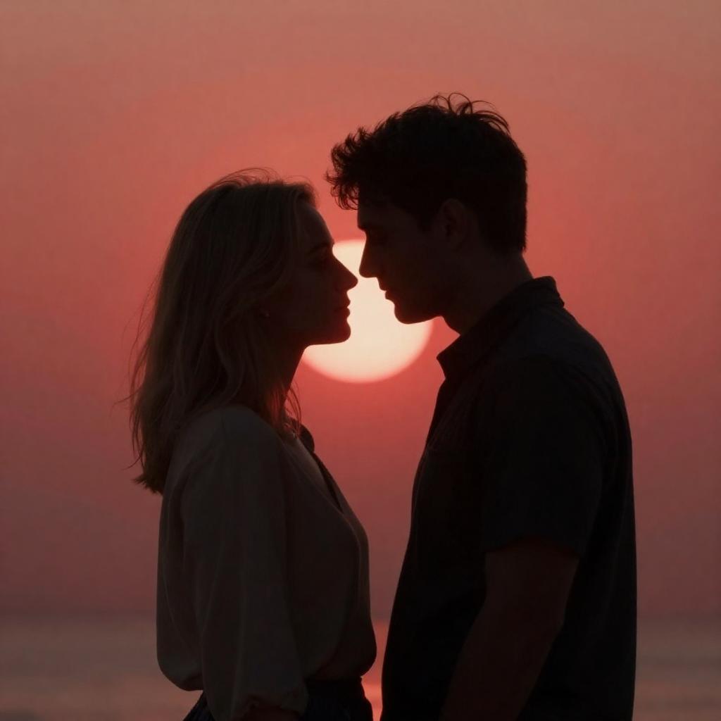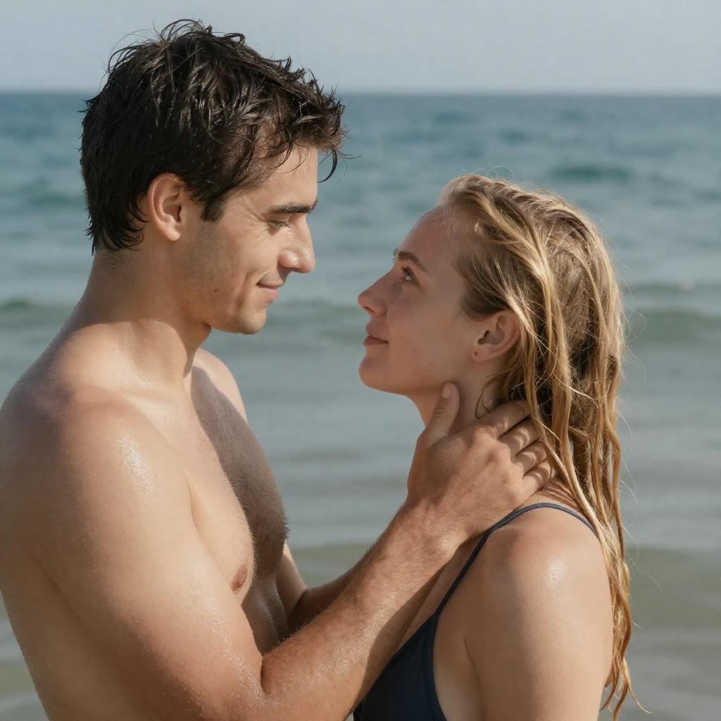 Photograph of a shirtless couple standing close by the ocean. The man, with short dark hair and a slight smile, gazes at the woman. She has wet, blonde hair and looks up at him. Sunlight highlights their wet skin. The blue ocean is blurred in the background. The man's hand gently holds her neck.