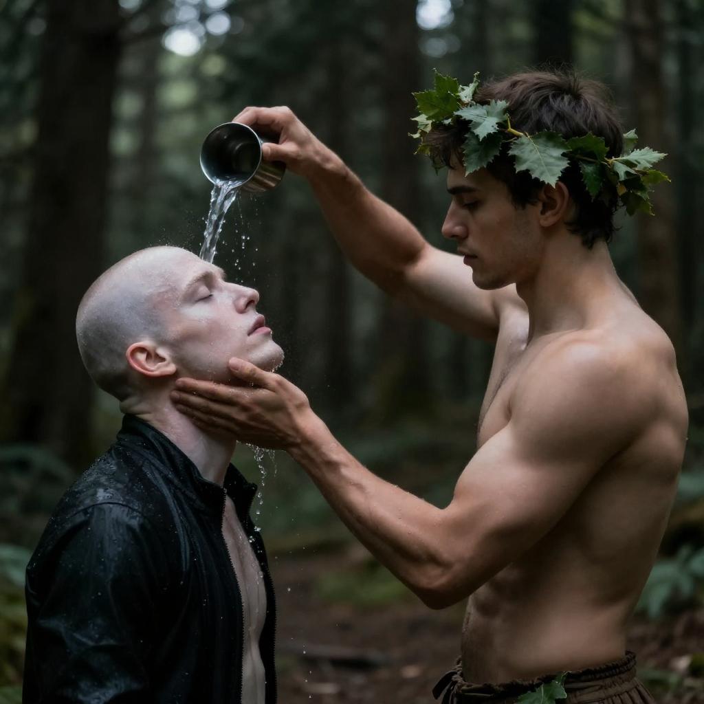 Photograph of a forest scene with a shirtless, muscular man with a green leafy headpiece pouring water over the face of a pale, clean-shaven man in a black jacket. The background is dark with tall trees. The clean-shaven man has his eyes closed and head tilted back, receiving the water.