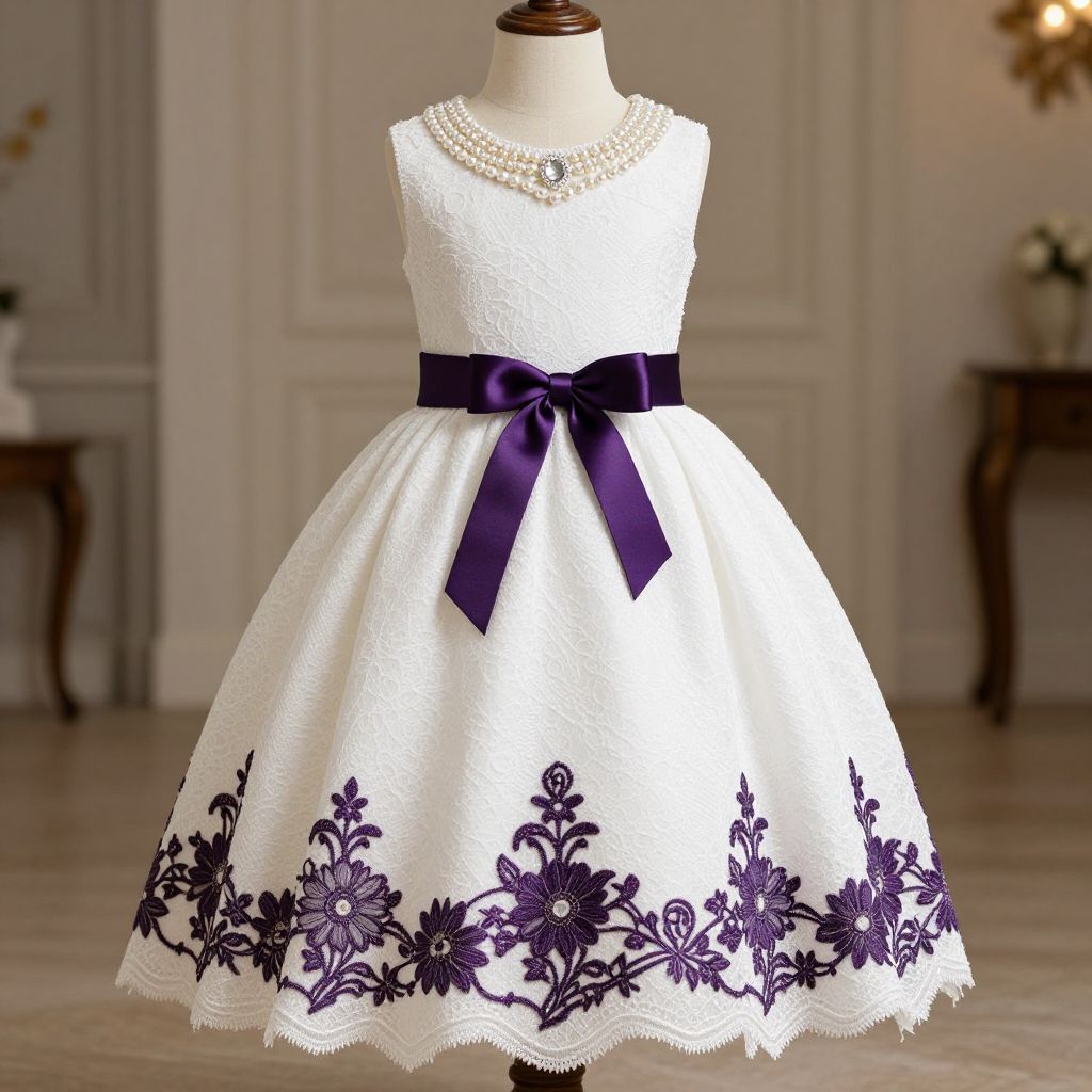 Elegant off-shoulder flower girl dress featuring a white lace bodice with delicate floral patterns, a burgundy A-line skirt, and a shimmering silver waistband, showcased on a mannequin against a neutral backdrop.