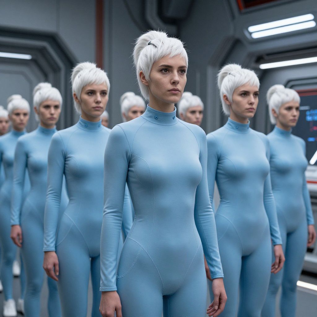 This photograph-like CGI image features a row of six women with short, white hair standing in a futuristic, metallic corridor. They all wear form-fitting, light blue bodysuits with long sleeves and high necks. The woman in the foreground has a serious expression, with a slender build and fair skin. The background shows a gray, industrial-style hallway with illuminated panels and metallic textures. The women are evenly spaced, creating a sense of uniformity and order. The lighting is cool and even, emphasizing the sleek, futuristic environment.