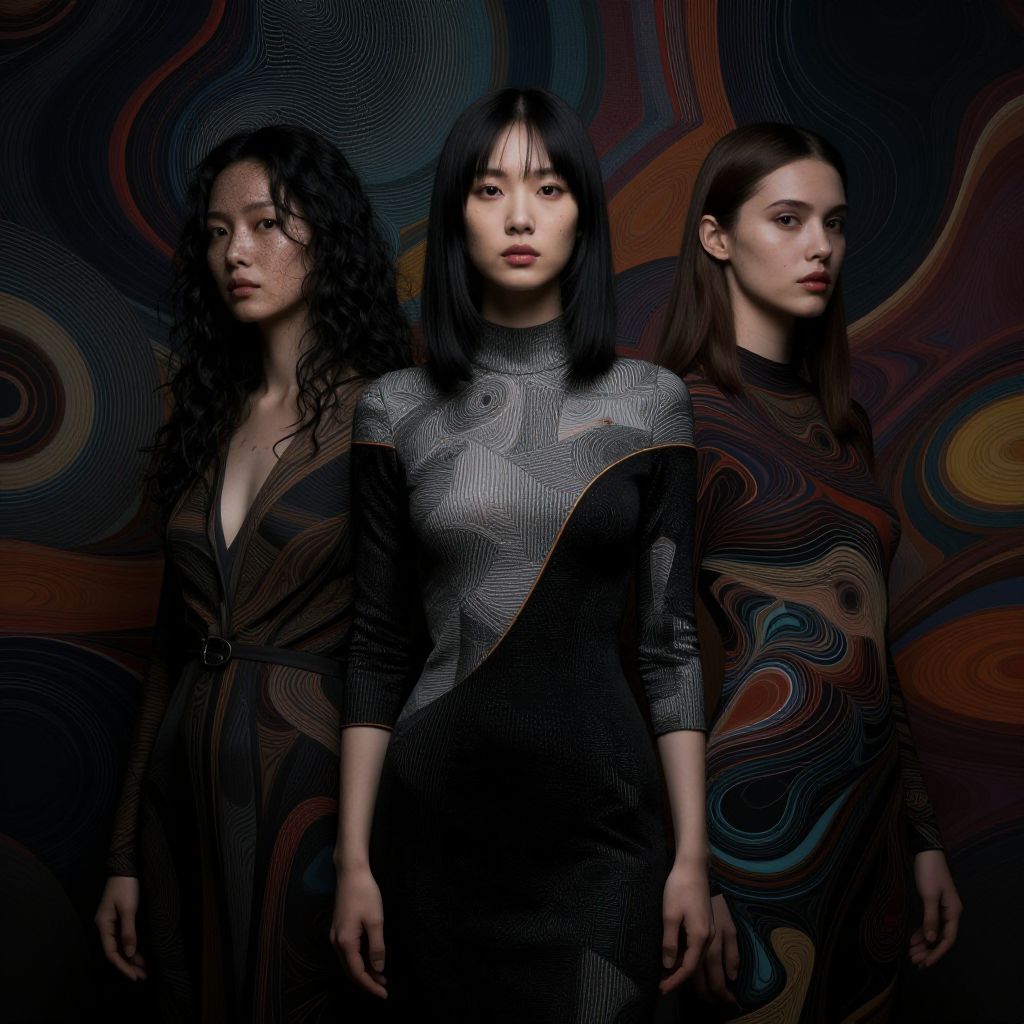 Photograph of three women with different hair styles and skin tones, wearing black and gray patterned dresses, standing against a swirling, abstract, dark background