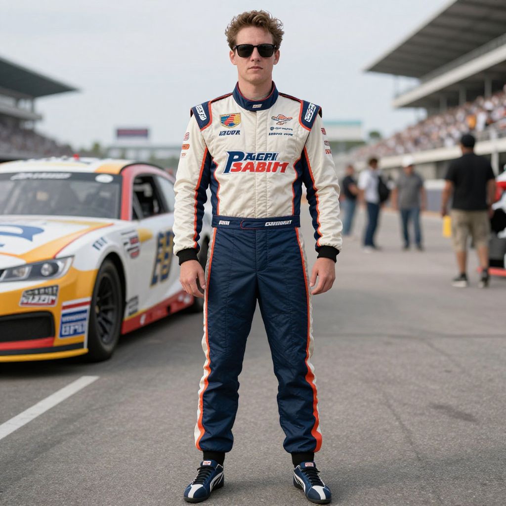 "Nascar Driver Outfit, man in a racing uniform and sunglasses standing in a pit"