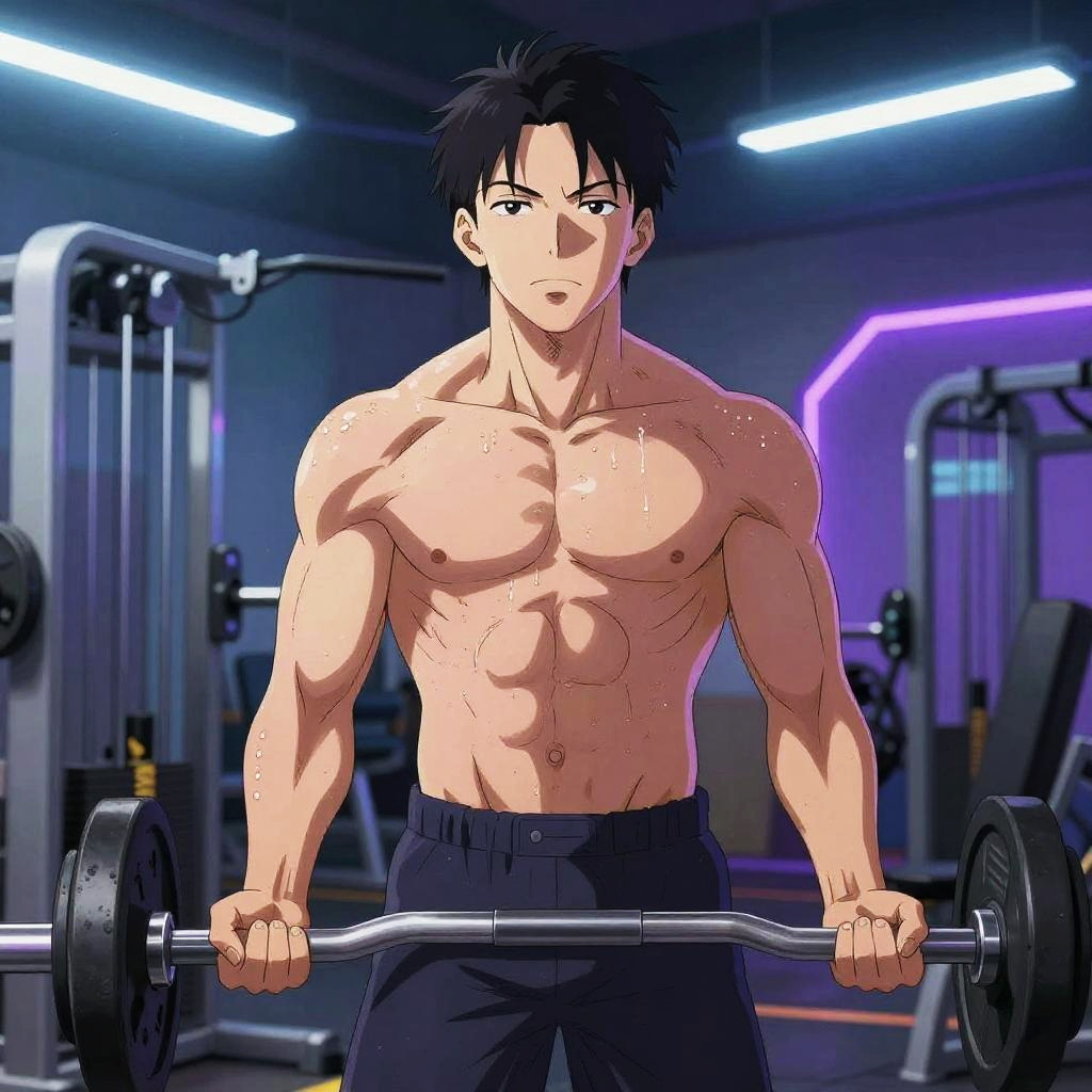 Anime athlete lifting weights in a high-tech gym, muscles defined, intense focus, futuristic gym equipment, cool blue and purple hues, sweat glistening under bright LED lights.