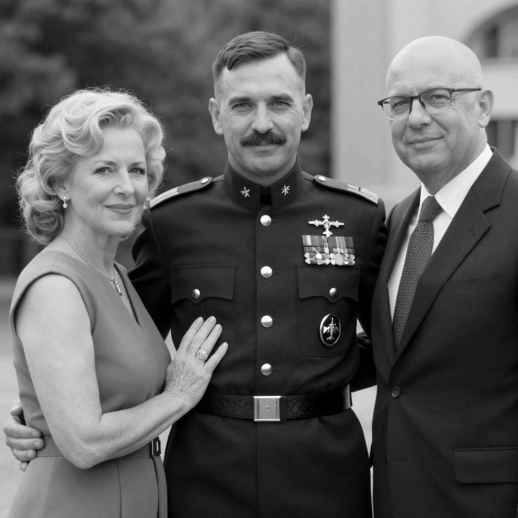 Black-and-white photograph of three people. Central military man with mustache, dark uniform, and medals, left arm around blonde woman with curled hair, earrings, and sleeveless dress, right arm held by bald man in glasses, formal suit. Background blurry.