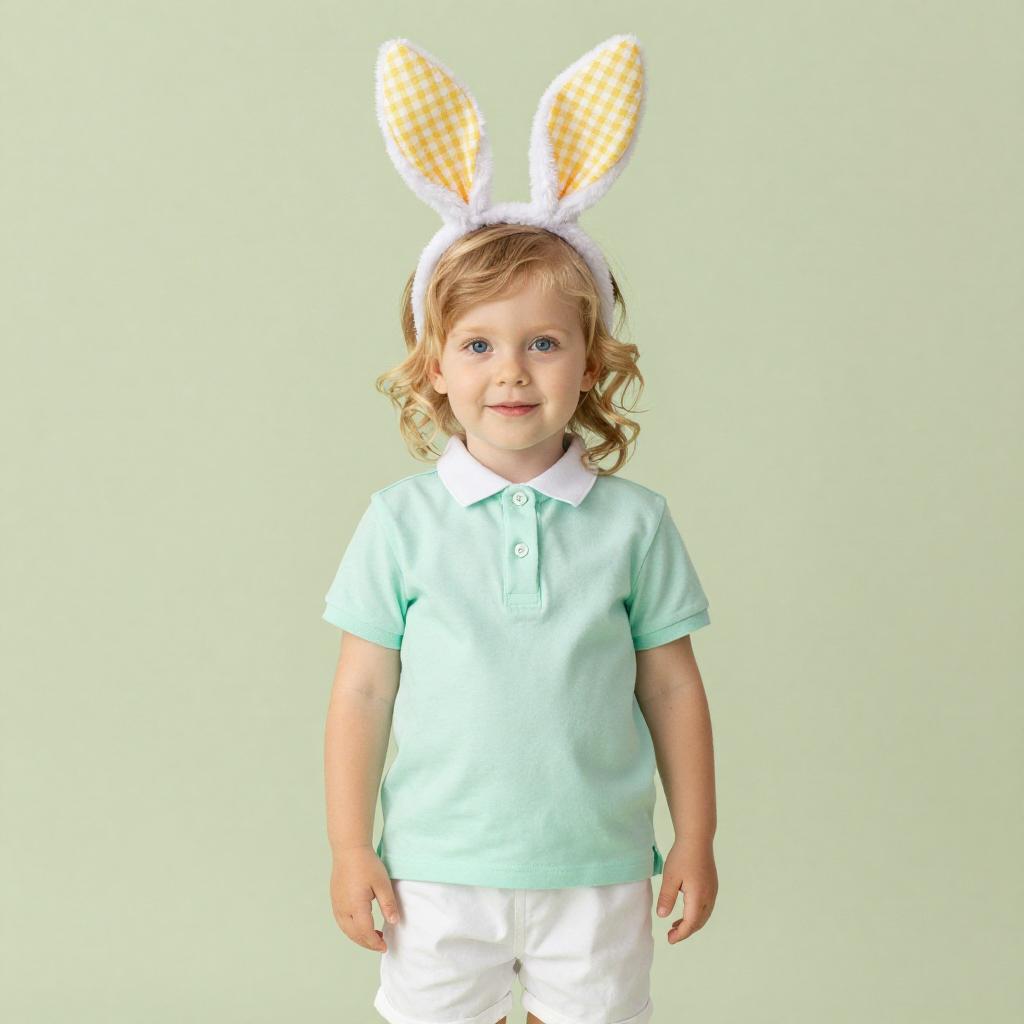 Portrait of a charming toddler with wavy blonde hair and blue eyes, wearing a mint green polo shirt with white collar, white capri pants, and a gingham check bunny ear headband. The child stands against a soft pastel green studio background with natural light, embodying a spring Easter theme.