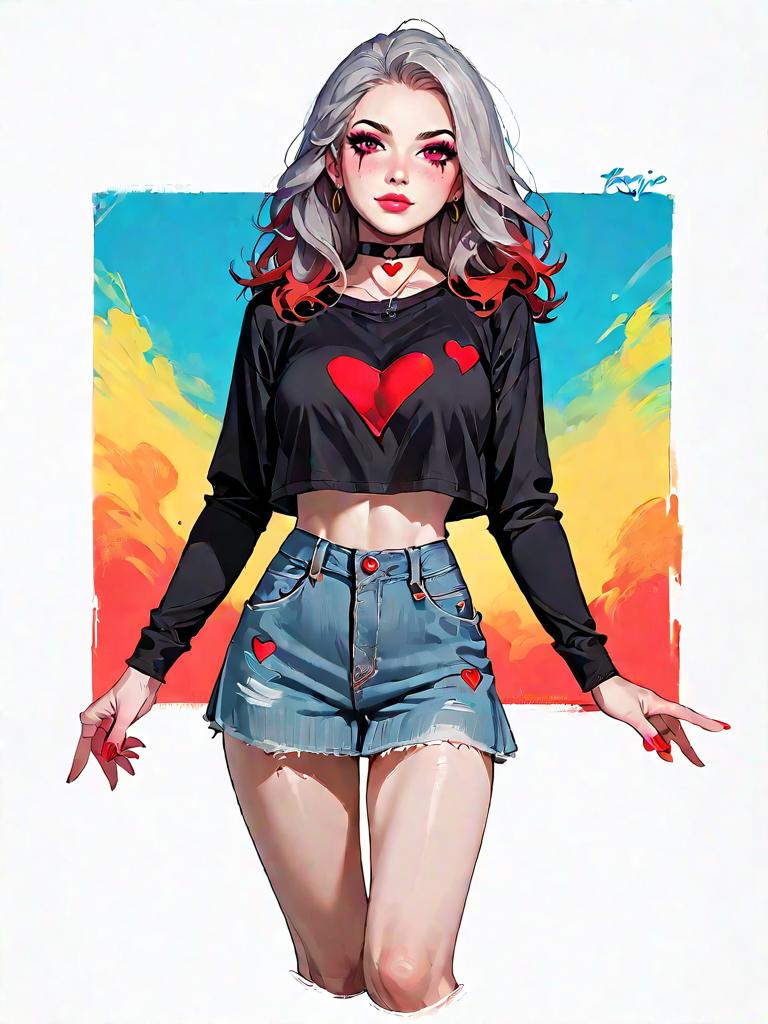 Full body illustration of a young woman with pink hair and green eyes, dressed in a boho-chic textured jacket with patchwork design and white shearling collar, layered necklaces, distressed denim shorts with frayed hem, black opaque tights, and a simple blue tank top. The background is neutral and studio-style, emphasizing the detailed fashion elements and her realistic facial features.