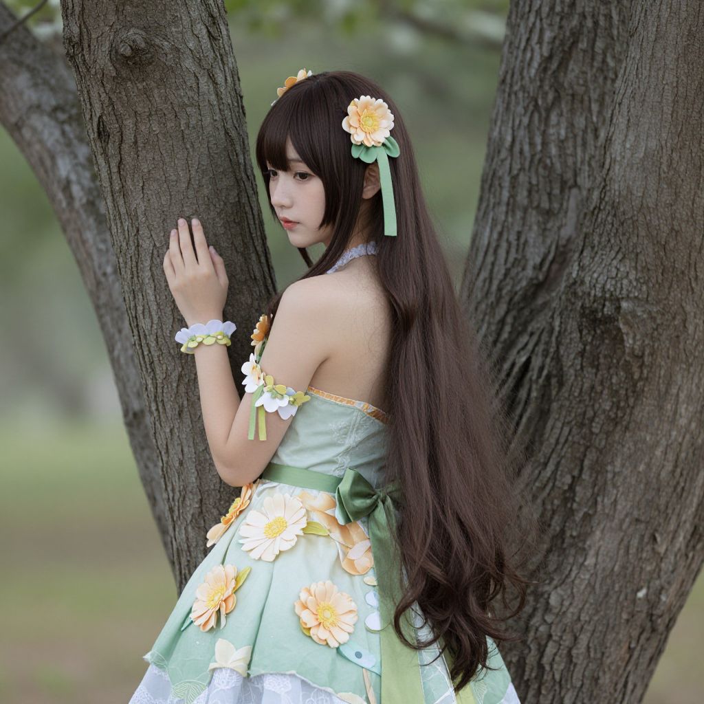 Winx flora costume, 1girl, flower, dress, hair ornament, long hair, plant, brown hair, solo focus, tree