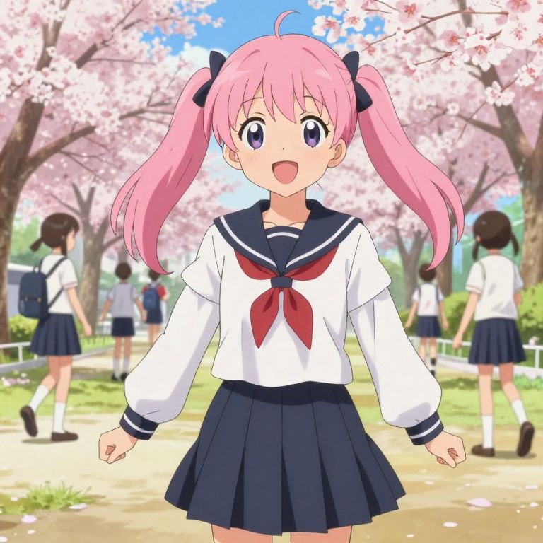 Anime character creation depicting a cheerful schoolgirl with pastel pink hair and expressive eyes, dressed in a detailed sailor uniform, standing on a bustling city street under rain with glowing reflections, soft lighting, capturing everyday life in anime style with warm and inviting tones.