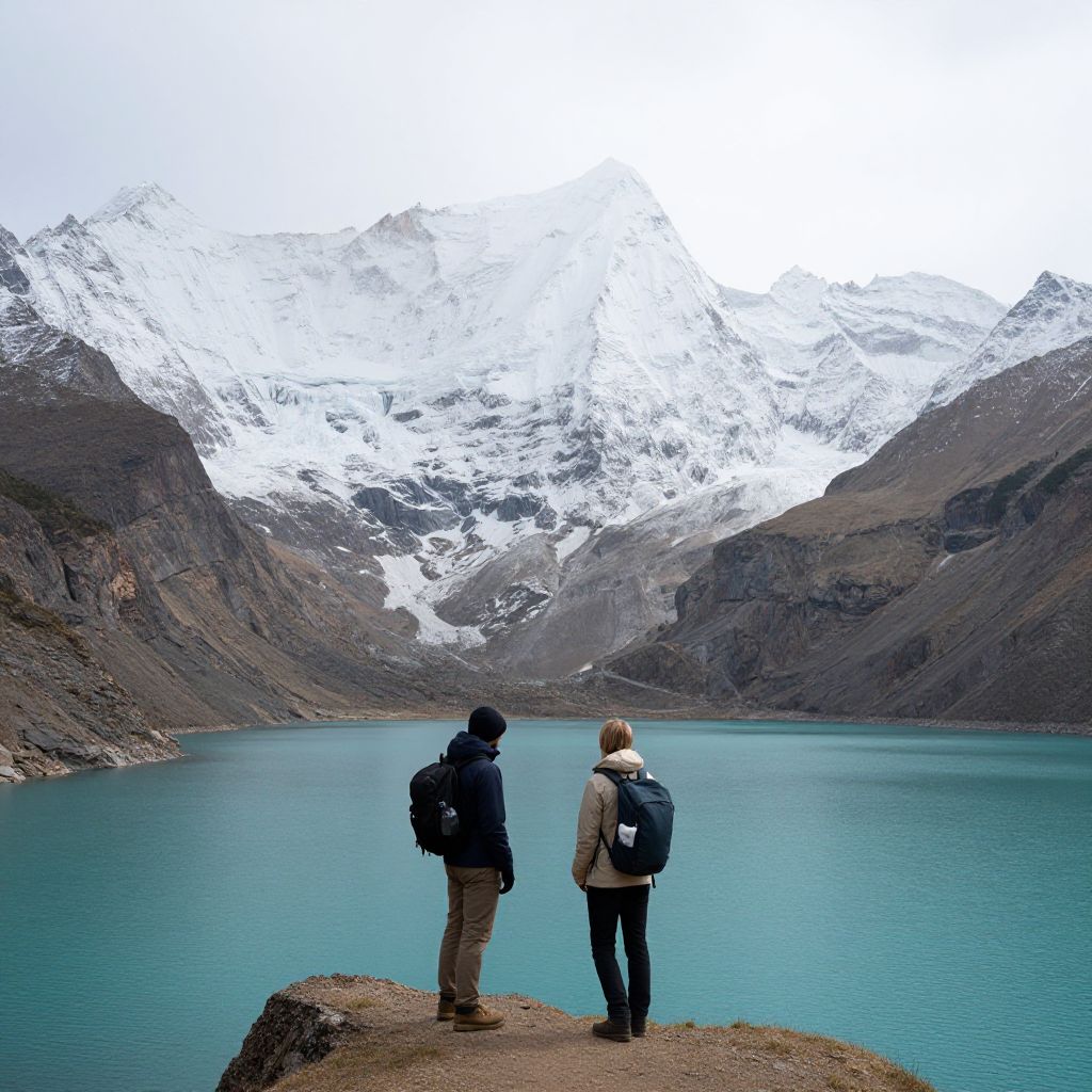 Amidst the ethereal embrace of towering snow-capped peaks and the serene turquoise waters of Cullicocha Lake, two hikers stand as silent sentinels, their journey embodying the timeless dance between human resilience and nature’s majestic indifference.