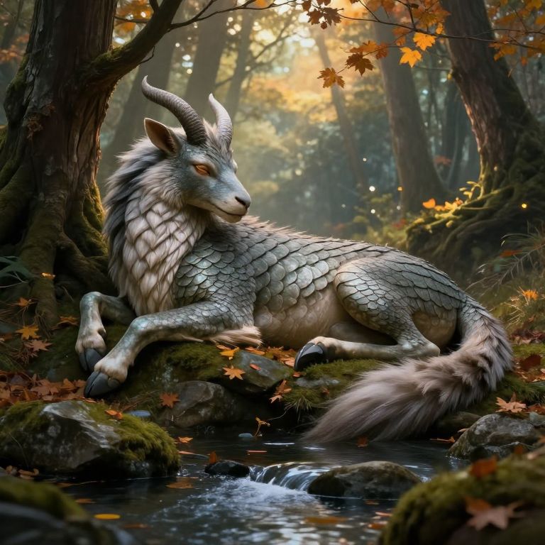 Digital fantasy artwork of a dragon-goat hybrid with silver scales, horns, and fur, lounging by a forest stream in autumn.