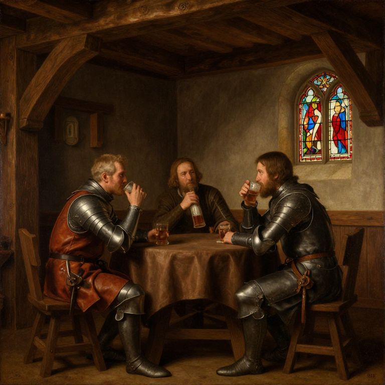 Medieval tavern painting showing a quiet corner with knight and minstrel sharing drink, heavy wooden beams above, stained-glass window casting colored light, detailed textures of worn leather and metal, classic renaissance style with warm palette