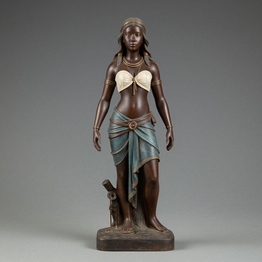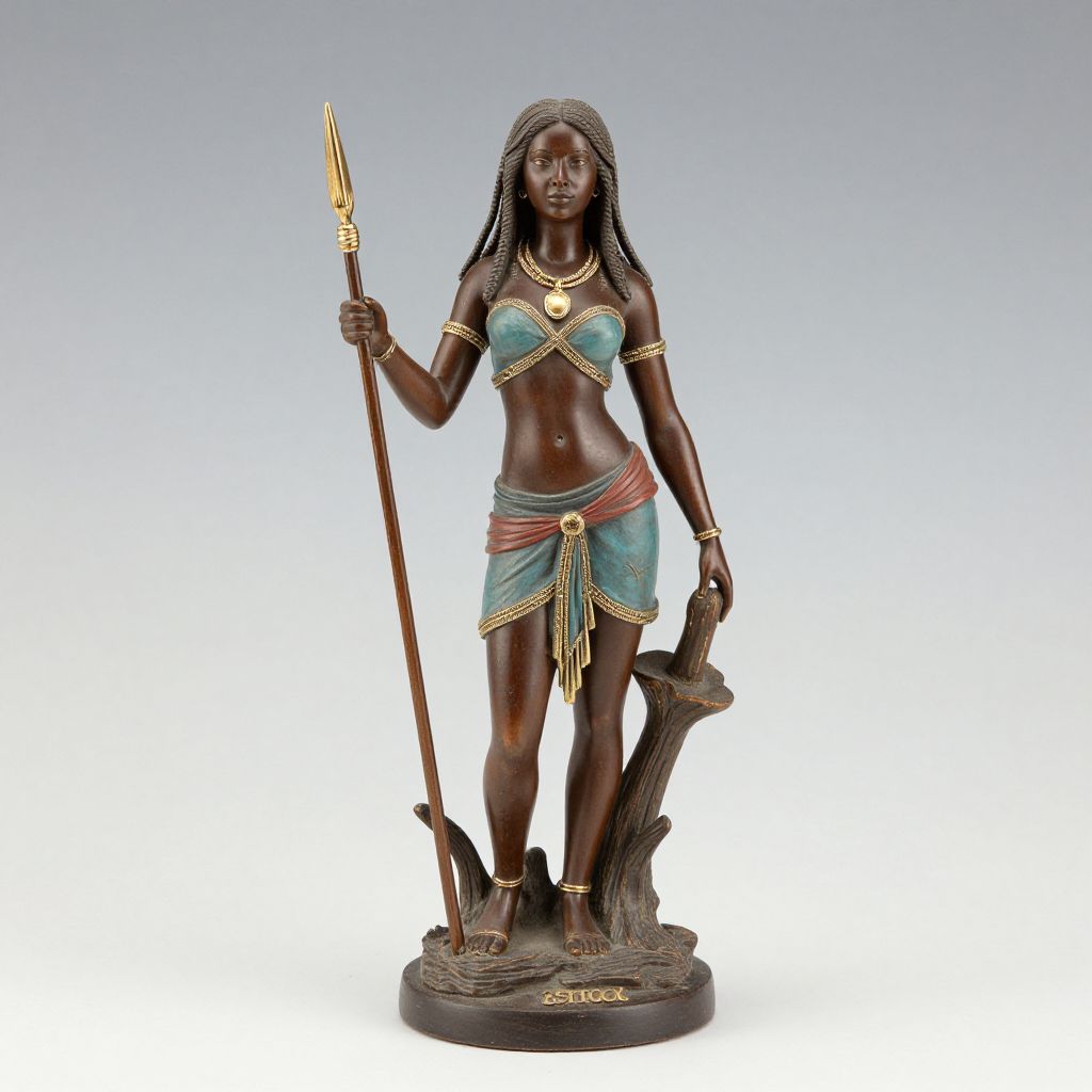 Photograph of a dark brown, bronze-colored statue of a standing female figure with a medium build and smooth skin. She has long, wavy hair adorned with a small, circular headpiece. Her attire includes a white, bow-shaped top covering her chest, and a blue, draped skirt with a gold belt. She wears gold arm bands and a necklace. Her right foot is raised slightly on a small, rectangular pedestal. The background is a gradient from light to dark gray. The statue has a polished, glossy finish, highlighting its intricate details and cultural artistry.