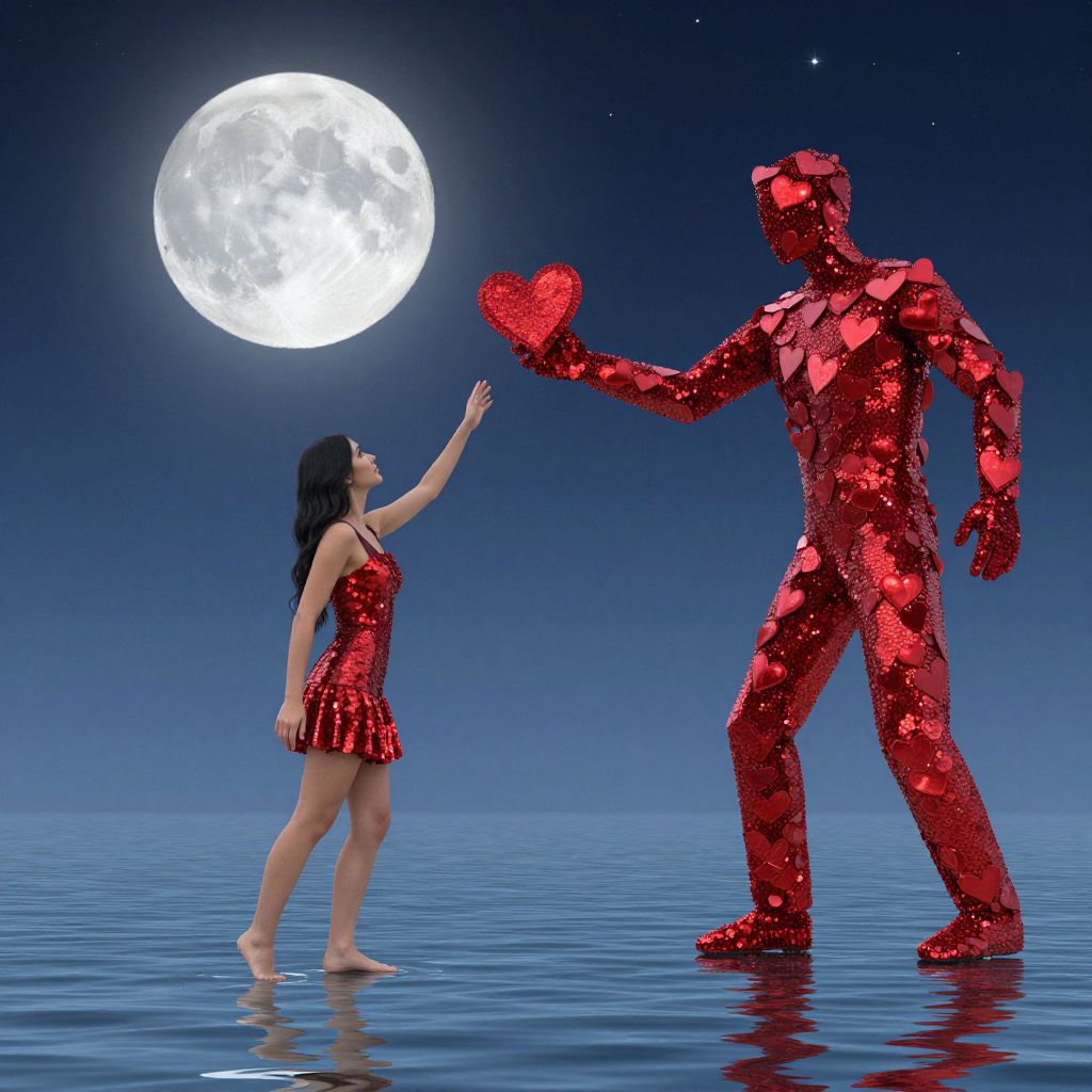 A digital artwork depicts a woman with long black hair wearing a red sequin dress, standing barefoot on a reflective blue surface under a bright, full moon. She extends her right hand to touch a red, glittering, humanoid figure with a heart-shaped red object in its left hand. The figure is also covered in sequins, standing to the right. The background is a gradient from dark blue at the top to lighter blue at the bottom, with a starry sky above. The scene is surreal and romantic.