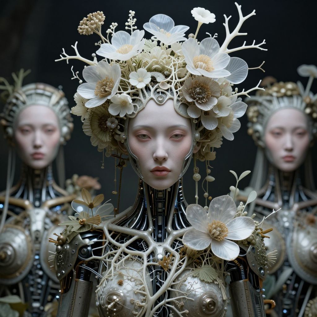 This is a digital artwork featuring a central female figure with pale skin and a serene expression. She wears a crown made of white, translucent flowers and delicate branches, which contrasts with her metallic, robotic attire. Her attire includes black and silver segments with intricate, mechanical details. In the background, two blurred, similarly styled female figures are visible, each with similar flower crowns and robotic elements. The overall composition has a dark, moody background, enhancing the ethereal and futuristic aesthetic of the figures. The image combines elements of sci-fi and fantasy, with a focus on intricate textures and detailed mechanical design.