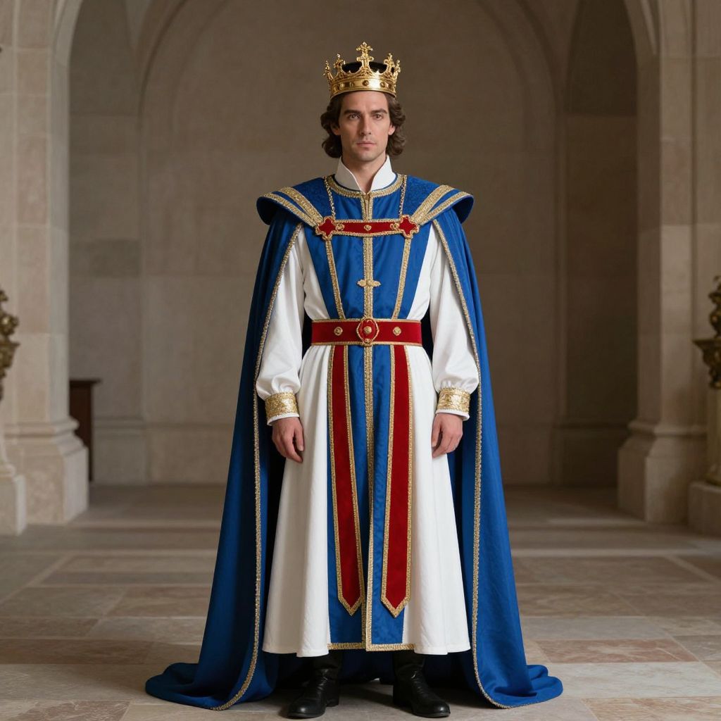 A regal and handsome man, sporting a majestic crown on his head, is depicted wearing an elegant blue and white outfit accented with a striking red and gold belt. Full body shot, highly detailed, cinematic lighting.