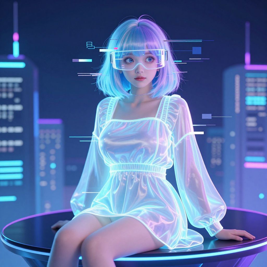 Digital art of a young woman with pale skin and short, glowing blue hair, wearing a semi-transparent, neon-lit, white long-sleeve dress. She sits on a circular black table in a futuristic cityscape with neon-lit skyscrapers in the background. Her large, expressive blue eyes are covered by a digital overlay of white lines and pixels. The scene is bathed in blue and purple neon light, creating a cyberpunk aesthetic. The woman's dress glows with a soft blue luminescence, contrasting against her pale skin. The image has a sleek, futuristic, and ethereal vibe.